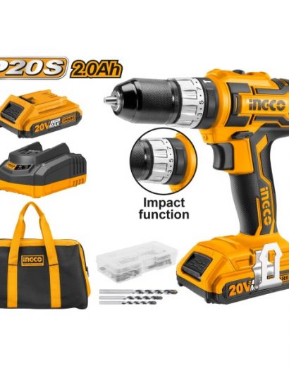 CIDLI20025 Voltage:20V No-load speed:0-400/0- 1500/min Max.impact rate:22500/min Max.torque:45NM Chuck capacity:0.8-10mm Torque settings:18+1+1 Mechanical 2-speed gear 20V Lithium-Ion 2.0Ah batteries With 2pcs battery pack With 1pcs 2Hr charger Charge volts:220V-240V~50/60Hz Integrated work light LED battery power indicator With 50pcs accessories Packed by canvas bag