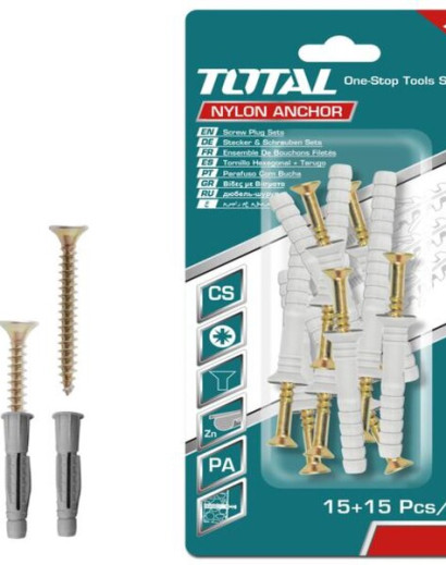 DESCRIPTION Plug 6x60mm Nylon,Grey color Screw 3.5x70mm Pozi drive, CSK head Heat treatment Yellow Zinc plated finish 15 pcs by blister card